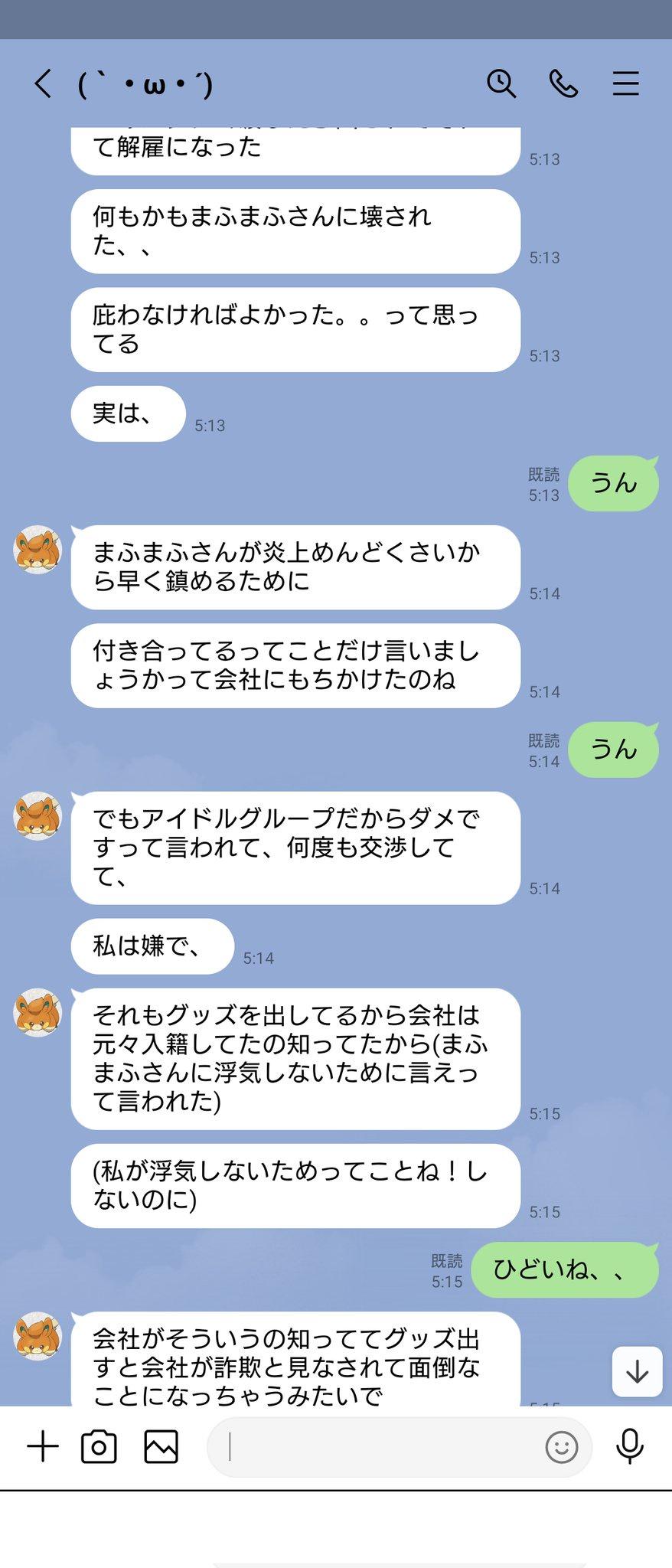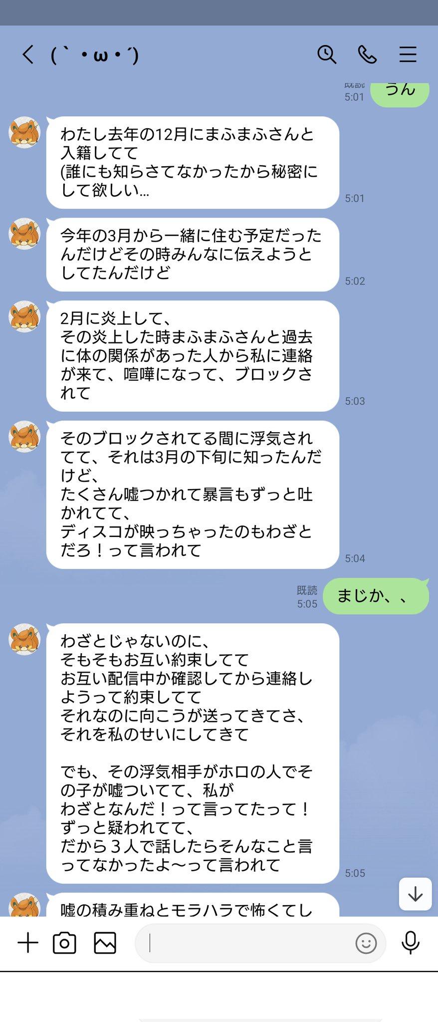 本来计划从今年3月开始同居,那时候打算告诉大家的,但2月份发生了炎上事件。在那次炎上期间,Mafumafu过去有过身体关系的人联系了我,于是我们(mafumafu与我)吵架了,然后我被拉黑。