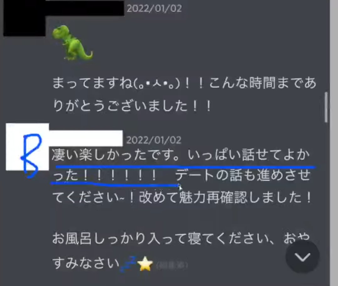 B子:真的很开心。能聊这么多太好了!!!!!! 请让我继续推进约会的事情~! 再次确认了您的魅力! 请好好洗个澡睡觉,晚安