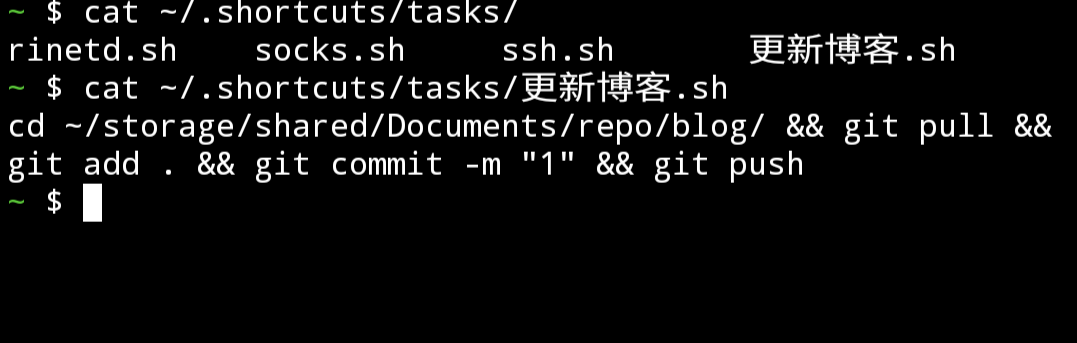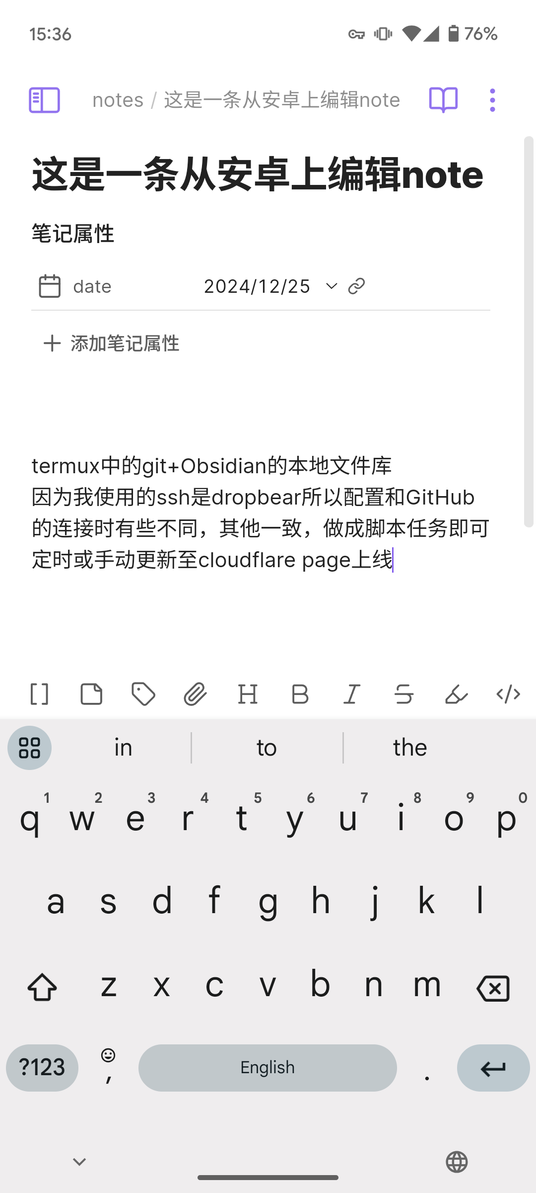 termux中的git+Obsidian的本地文件库 因为我使用的ssh是dropbear所以配置和GitHub的连接时有些不同,其他一致,做成脚本任务即可定时或手动更新至cloudflare page上线